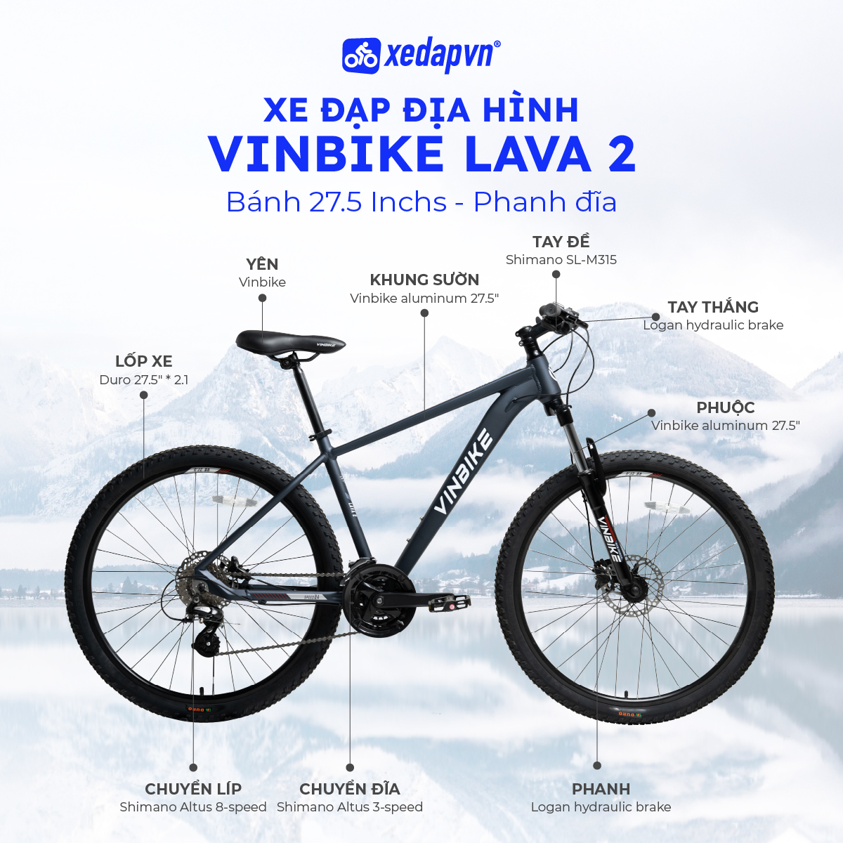 Xe Đạp Địa Hình MTB VINBIKE Lava 2 sở hữu thiết kế linh hoạt, cấu hình hiện đại, phanh đĩa mạnh mẽ dễ dàng chinh phục nhiều loại địa hình hiểm trở. Nổi bật hơn cả là vẻ ngoài bắt mắt, thời thượng không kém gì những dòng xe thuộc phân khúc cao cấp, vì vậy ngay sau khi ra mắt, sản phẩm đã được yêu thích nồng nhiệt và lọt top bán chạy nhất thị trường.