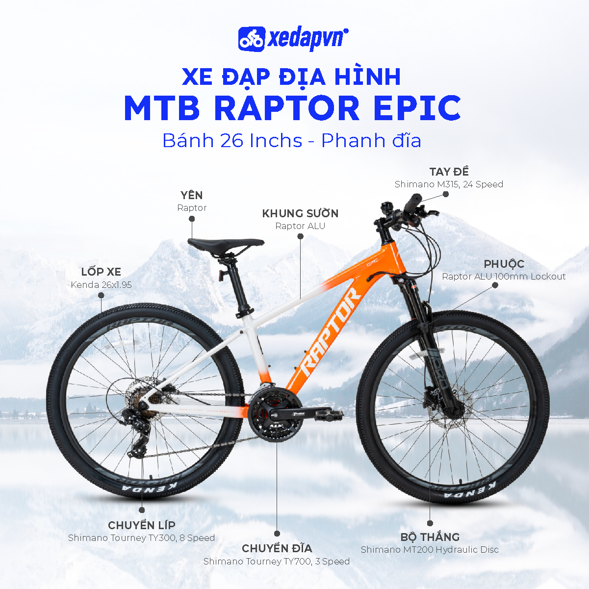 MTB RAPTOR Epic là dòng xe đạp địa hình mạnh mẽ đến từ thương hiệu Raptor, sở hữu thiết kế thể thao, hiện đại cùng cấu hình vượt trội, giúp chinh phục mọi địa hình từ đường phố đến đường rừng núi gồ ghề.