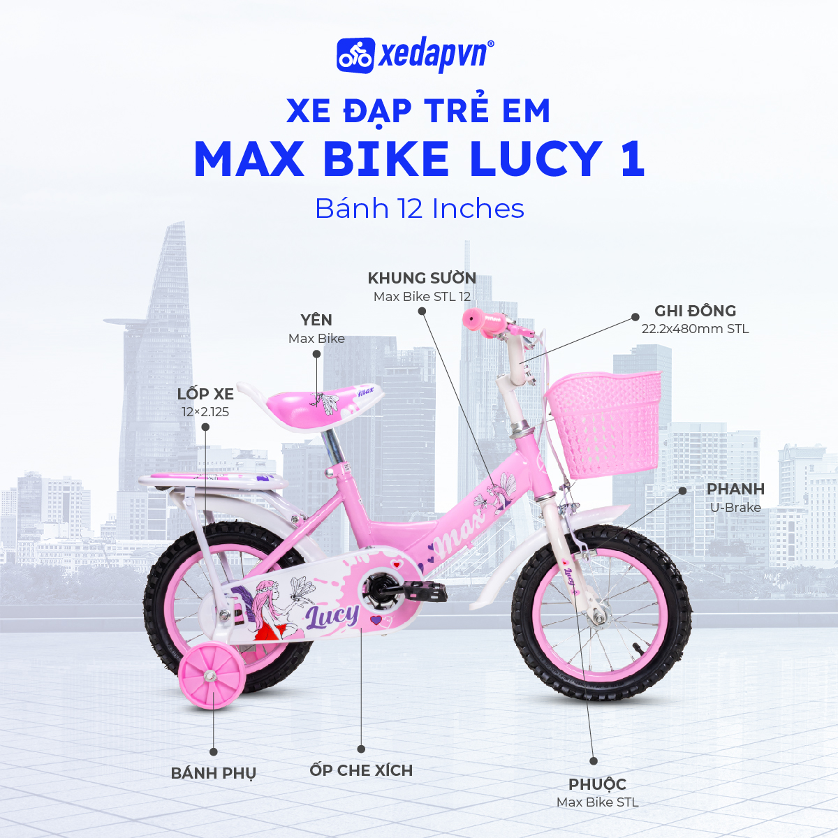 MAX BIKE Lucy 1 – bánh 12 inch là mẫu xe đạp trẻ em được thiết kế nhẹ nhàng, dễ thương và đặc biệt phù hợp với các bé mới bắt đầu tập đạp. Kích thước bánh 12 inch giúp xe luôn ở trạng thái cân bằng tốt, tạo cảm giác an toàn để bé tự tin làm quen với việc điều khiển xe.